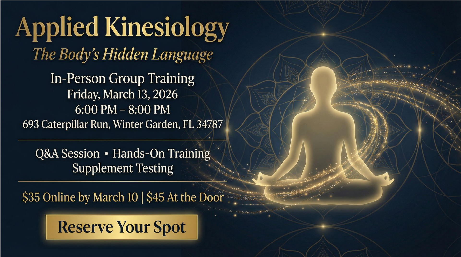 To make the training as practical as possible, we encourage you to bring any supplements or foods you’re unsure about. These will serve as excellent training tools for muscle testing. Please dress comfortably to ensure you can fully participate in all activities.